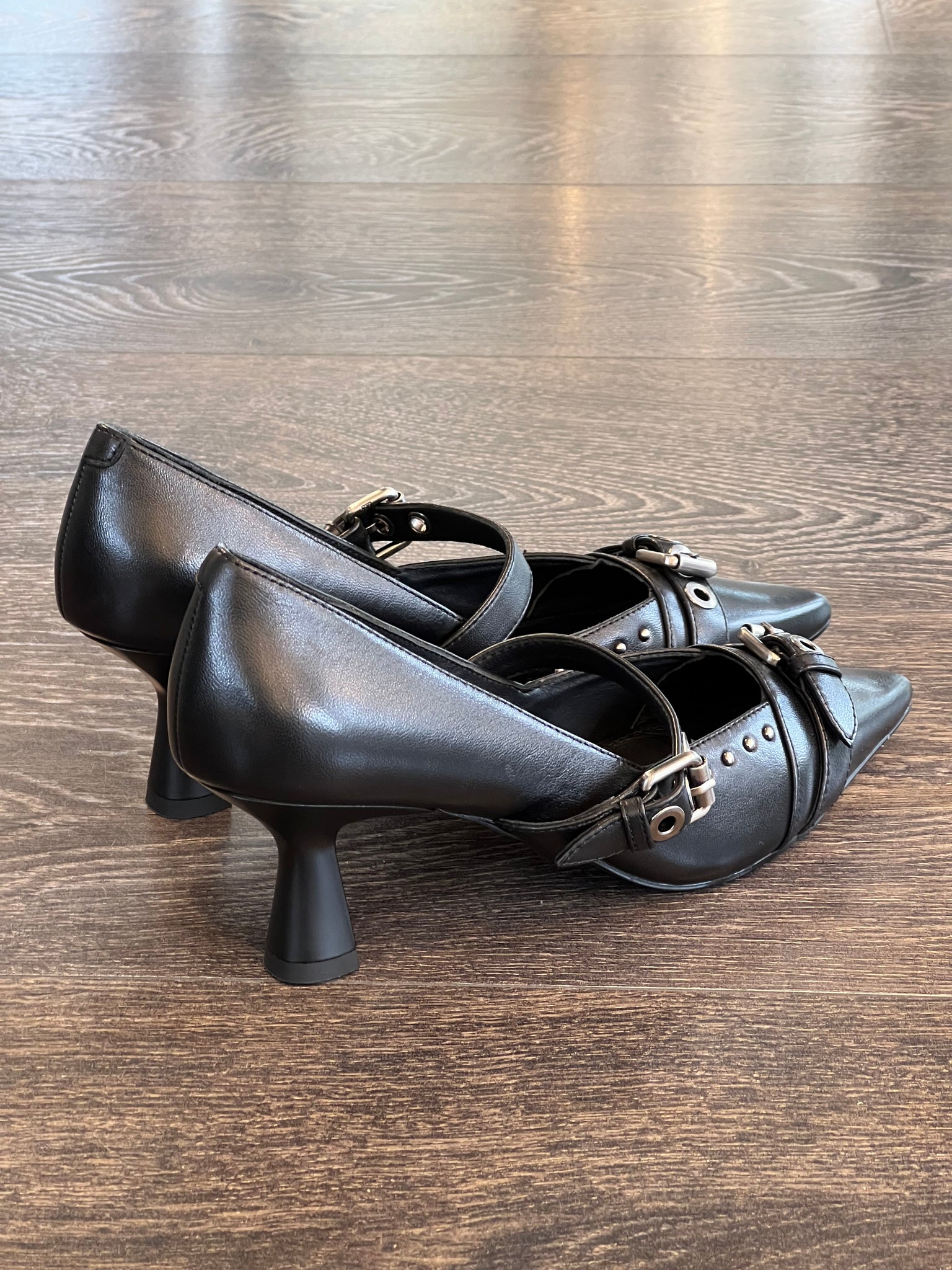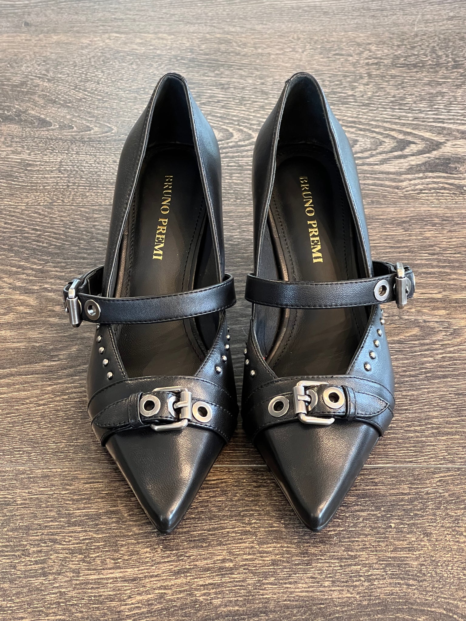 Bruno Premi decolletè a forma sfilata in morbida nappa nera, cinturino con fibbia sulla punta e sul collo del piede