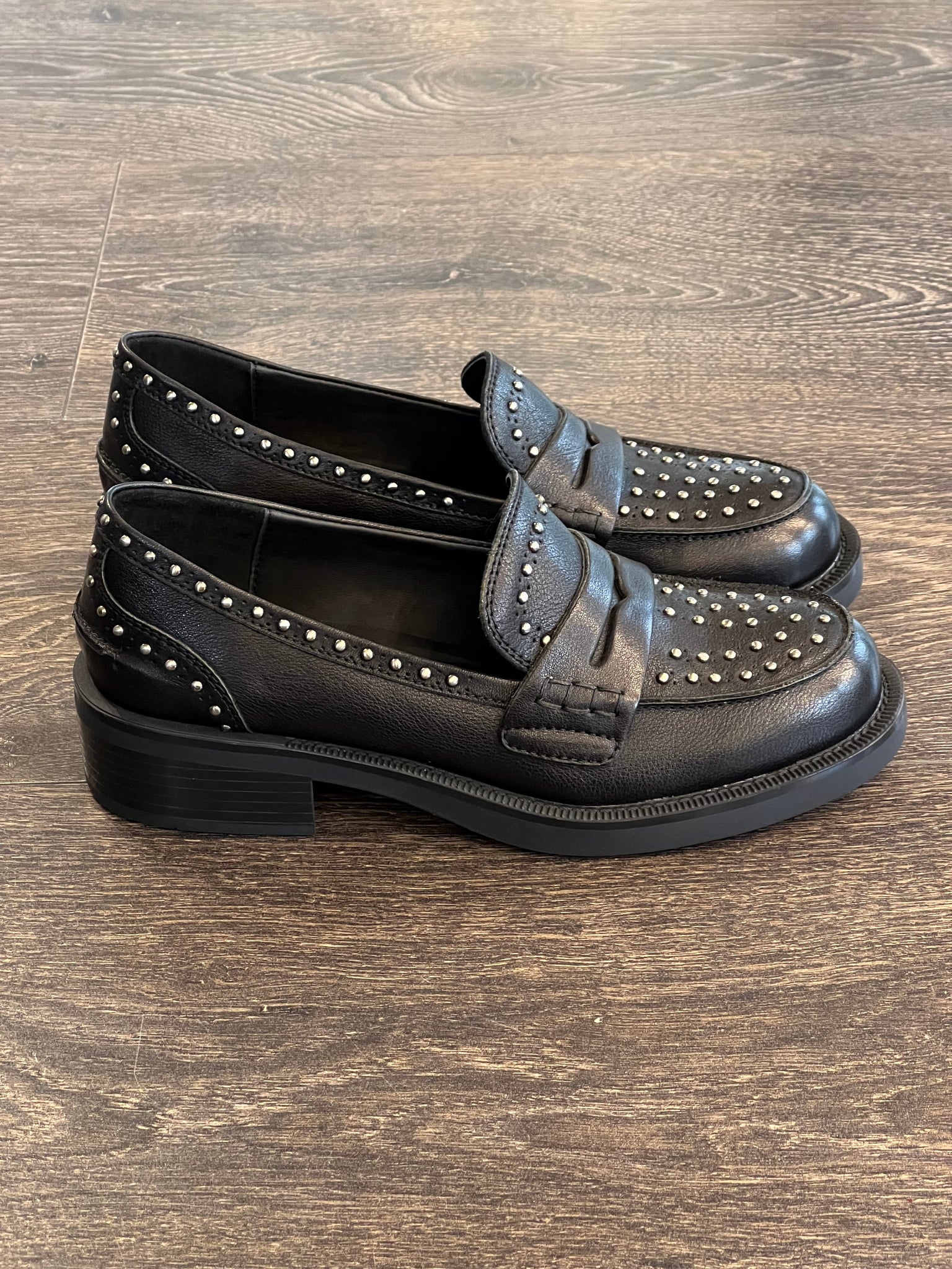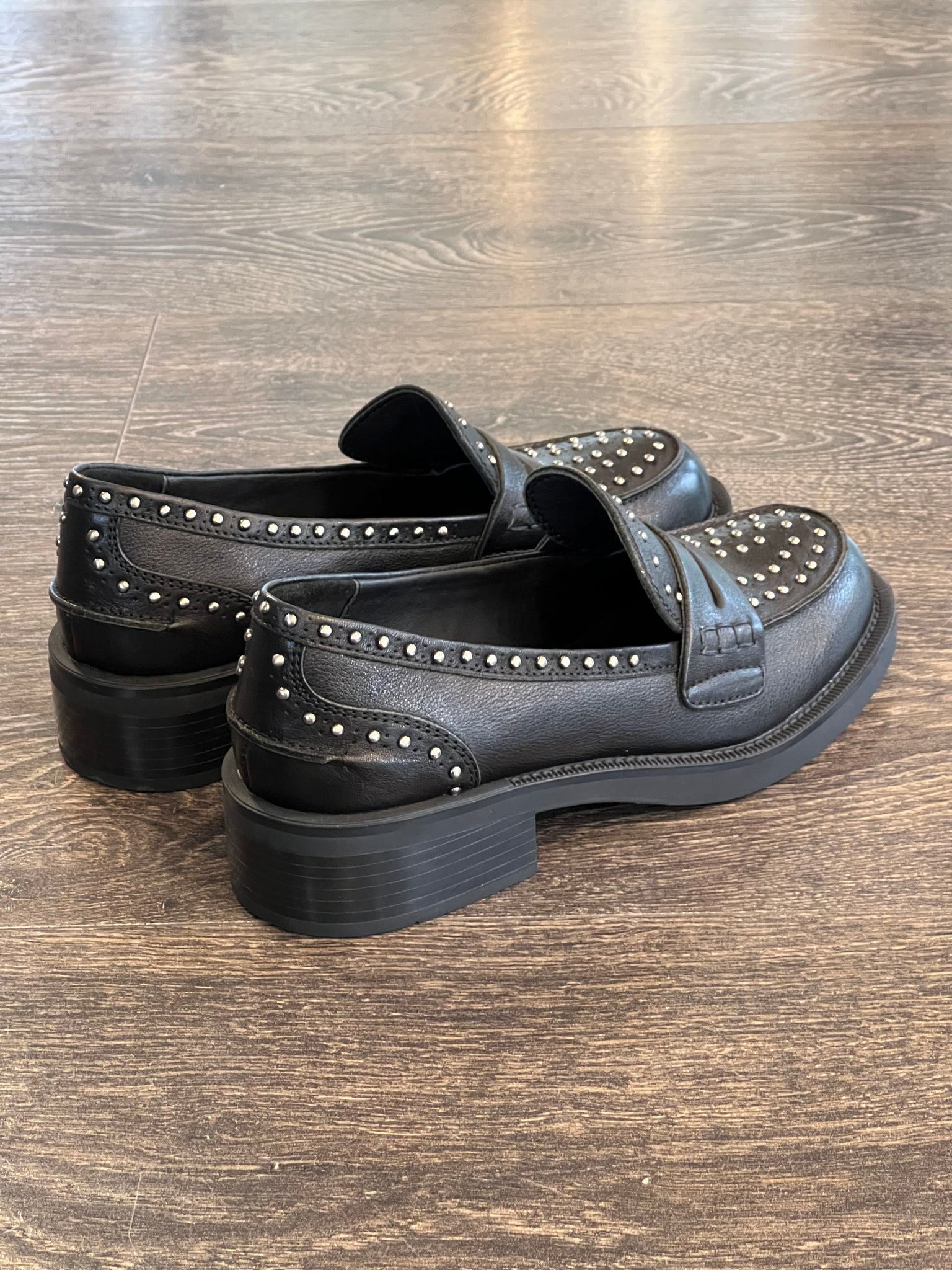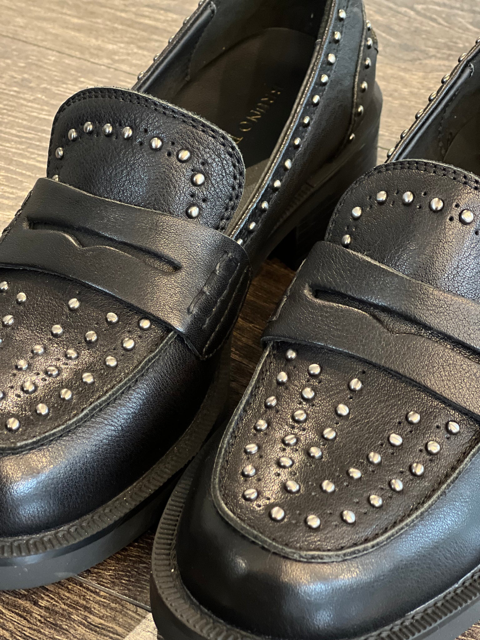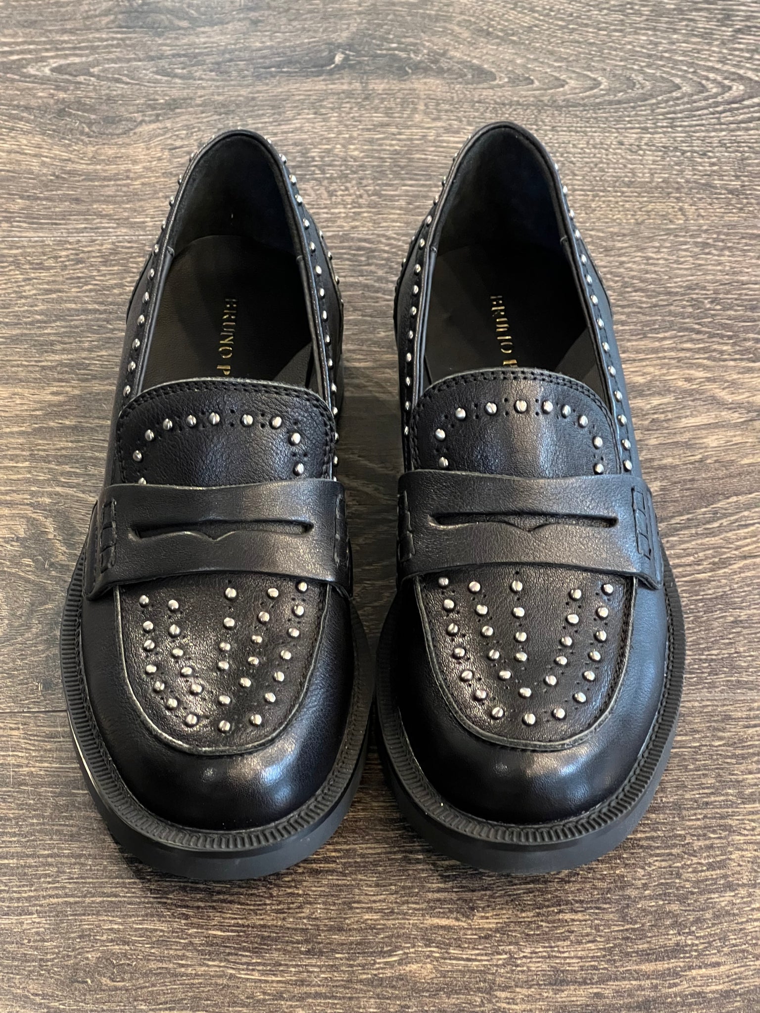 Bruno Premi mocassino in morbida nappa nera a forma arrotondata con micro borchie in metallo color antracite