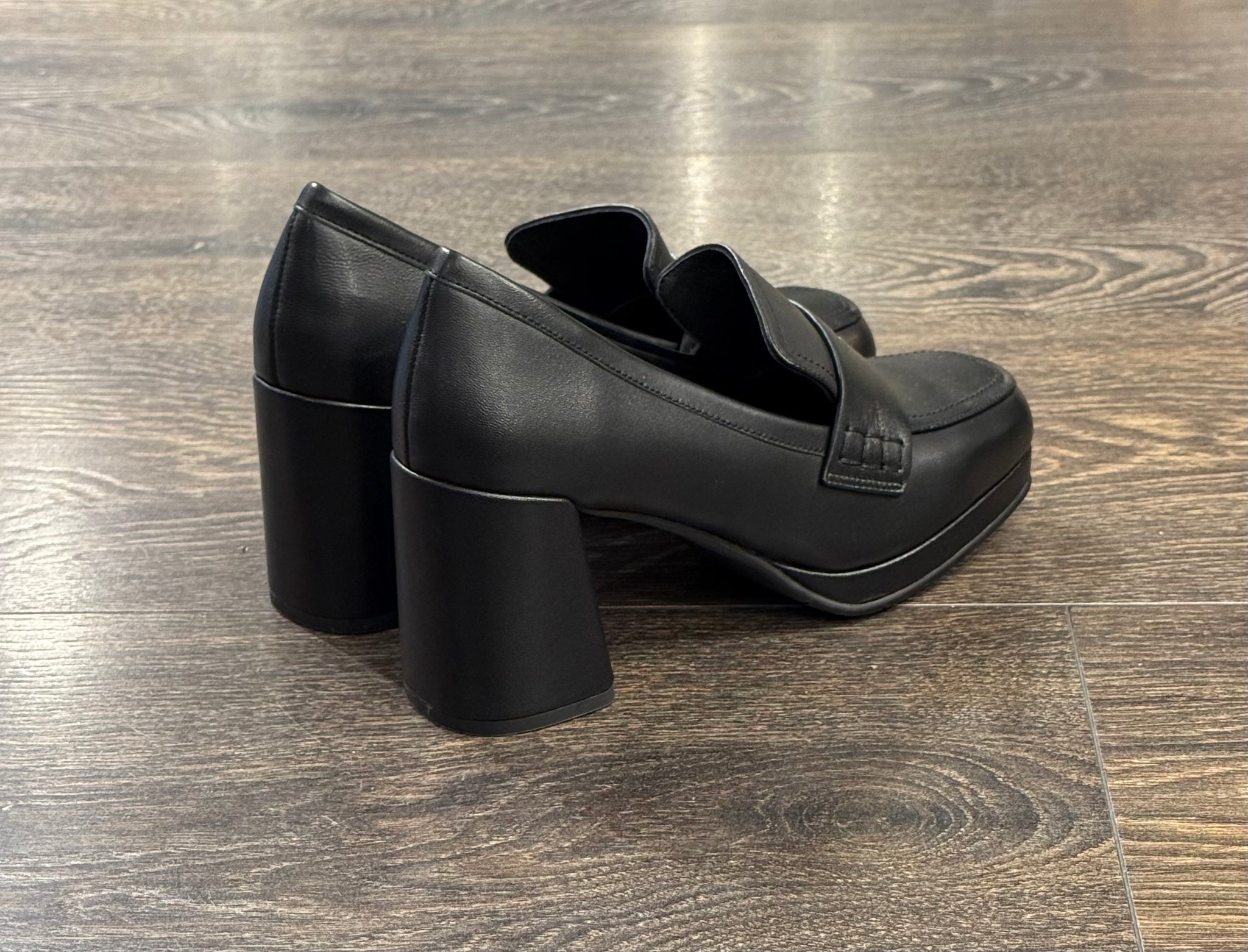 Bruno Premi mocassino in morbida pelle nera ,forma leggermente squadrata, tacco grosso alto 7 cm ricoperto nello stesso materiale,plateaux di 1 cm rendono la calzatura estremamente comoda