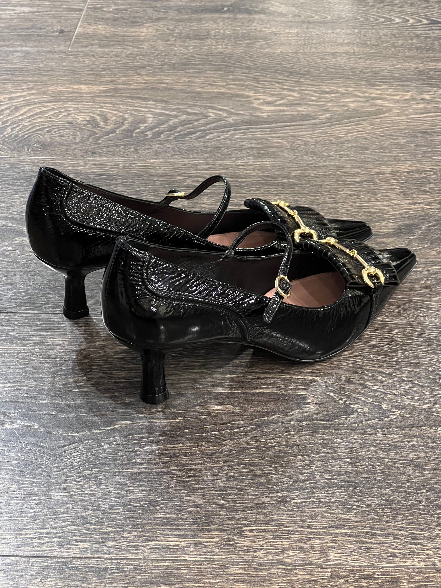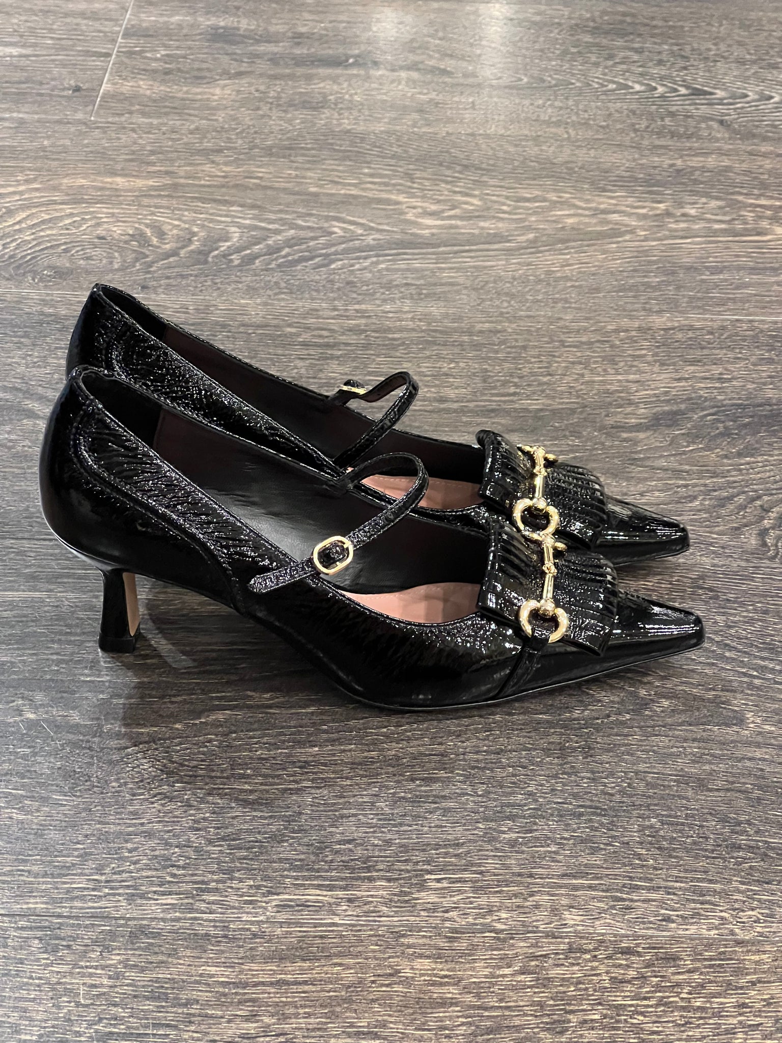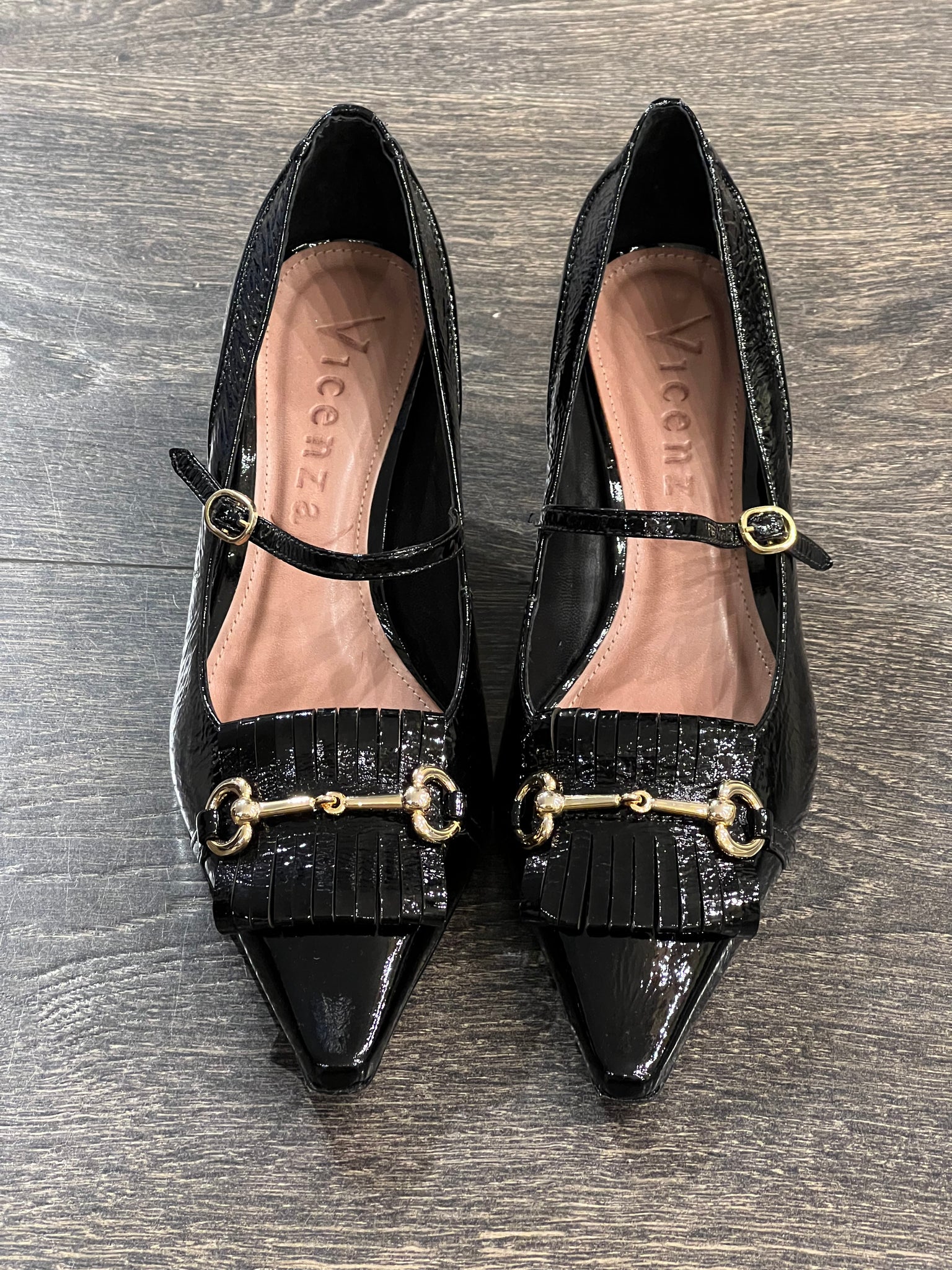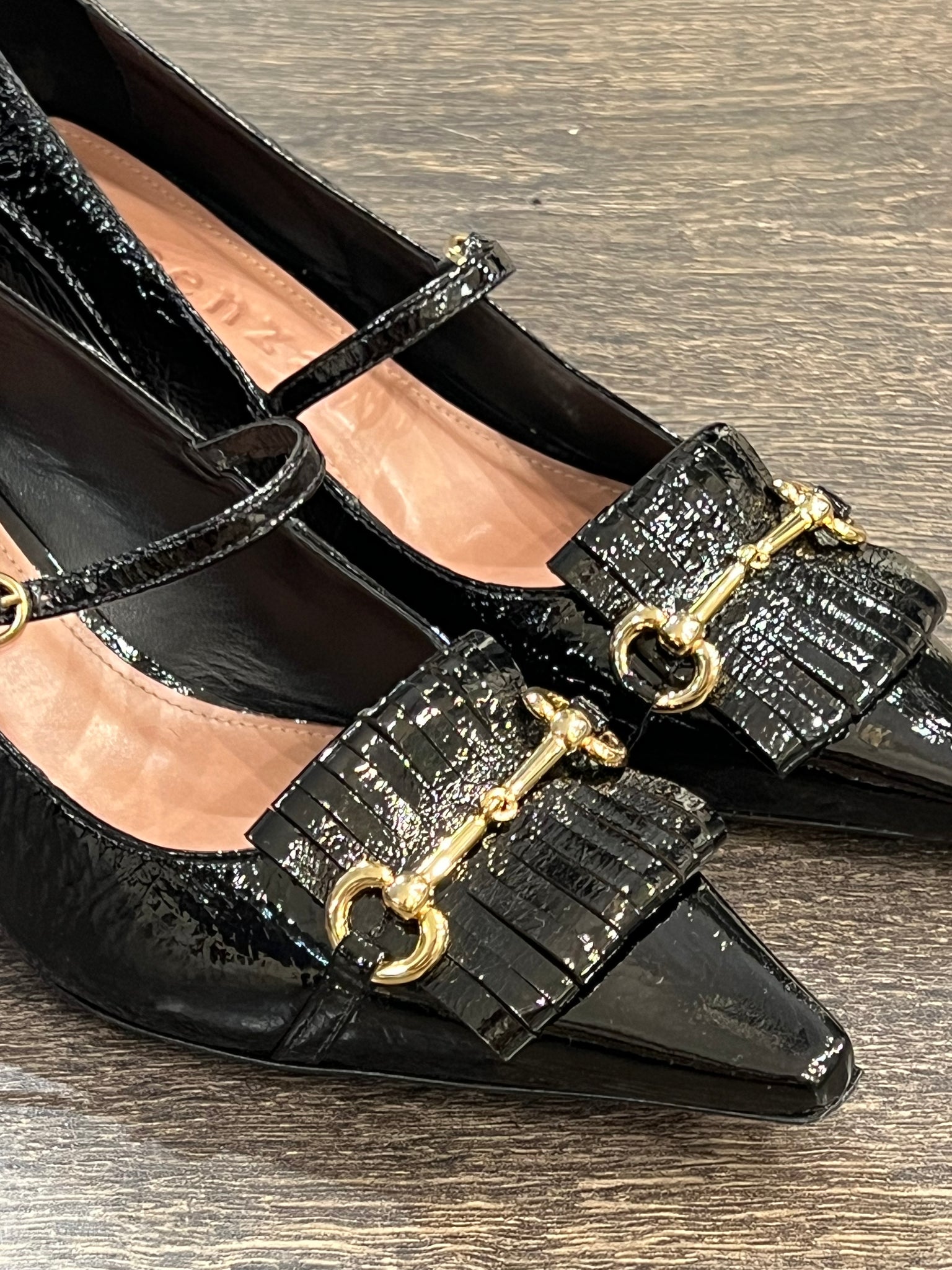Vicenza decollete in morbida vernice nera con cinturino sul collo del piede, accessorio oro e frangia in tinta sulla punta la rendono un mix tra un mocassino con il tacco ed una bebè
