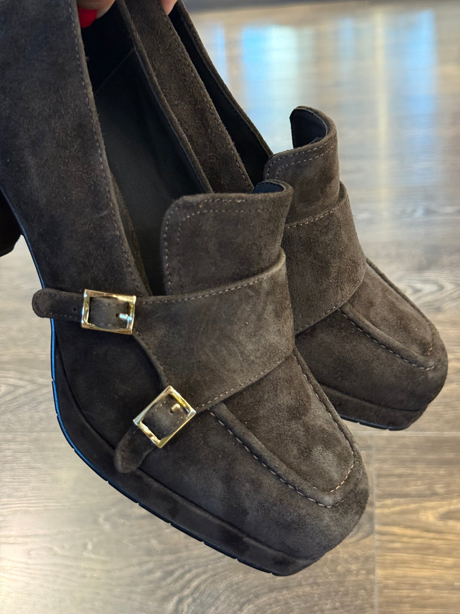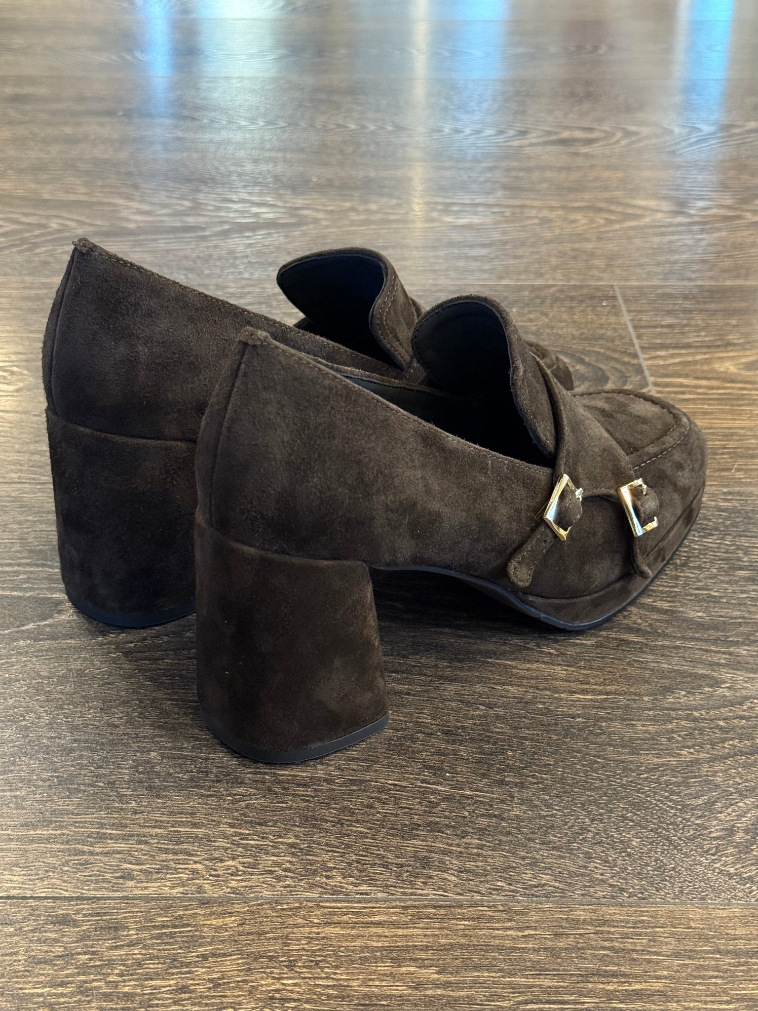 Bruno Premi mocassino in morbido camoscio marrone ,forma leggermente squadrata, 2 fibbie laterali regolabili, tacco grosso alto 7,5 cm ricoperto nello stesso materiale ,plateaux di 1 cm rendono la calzatura estremamente comoda