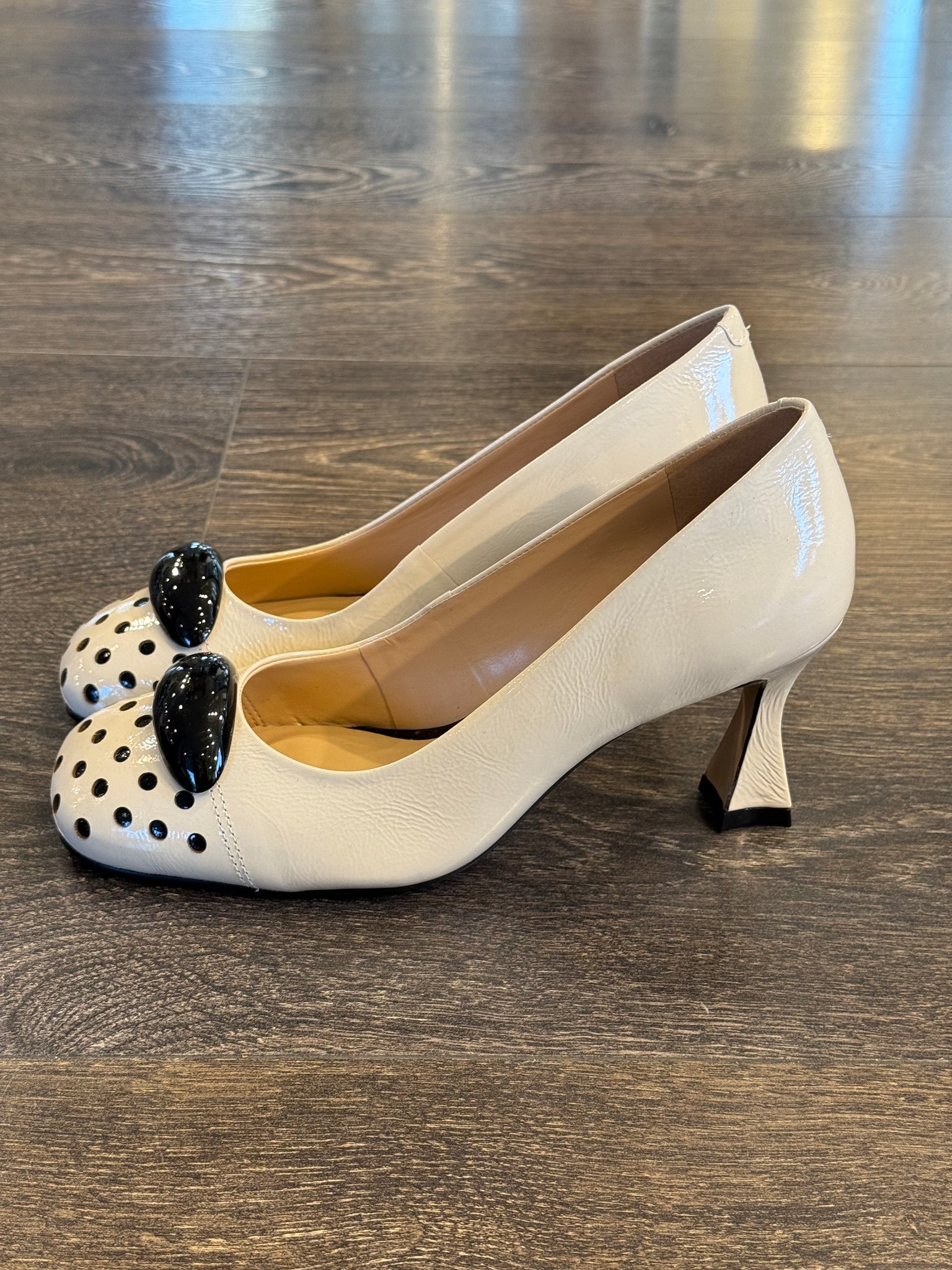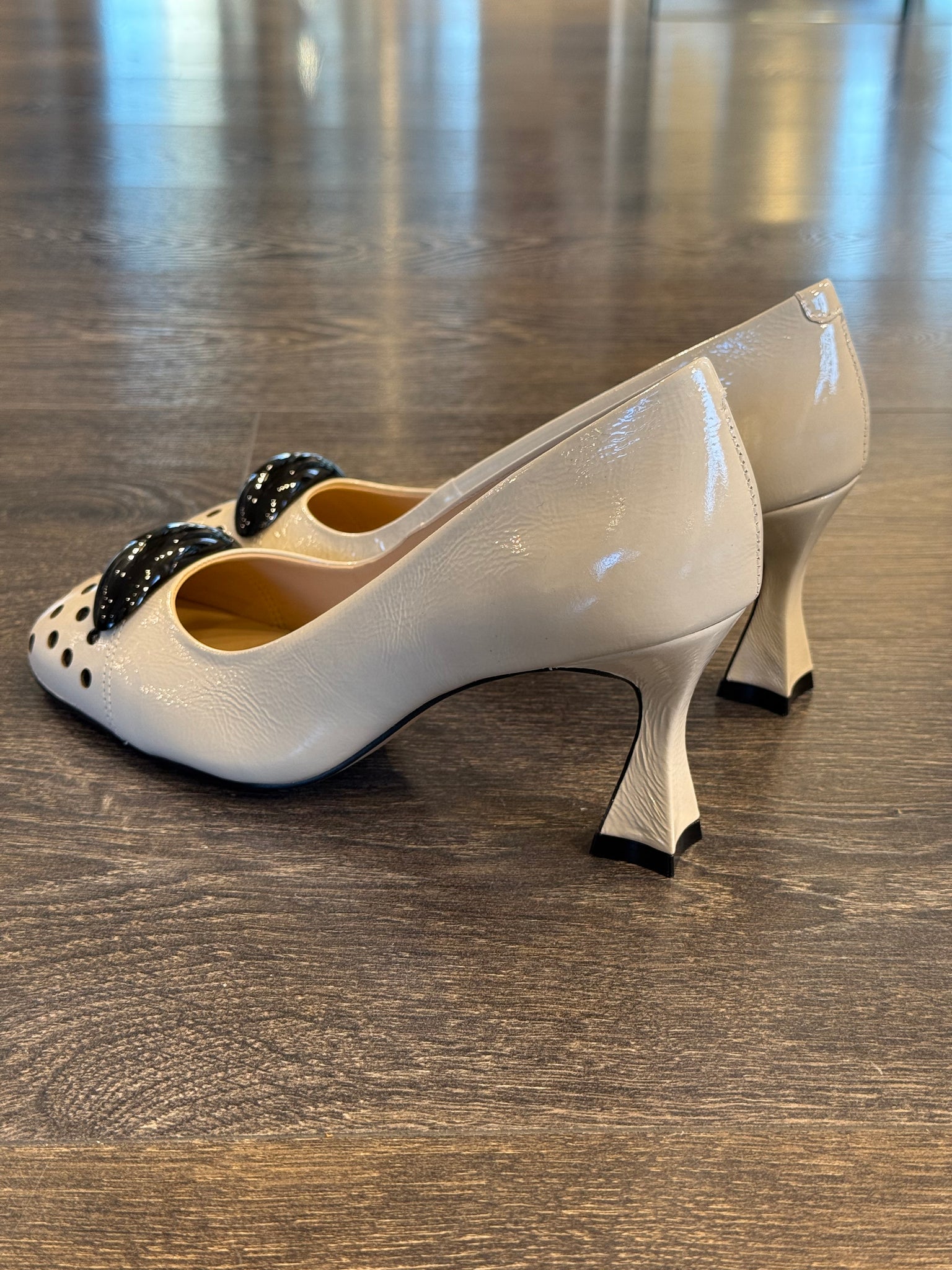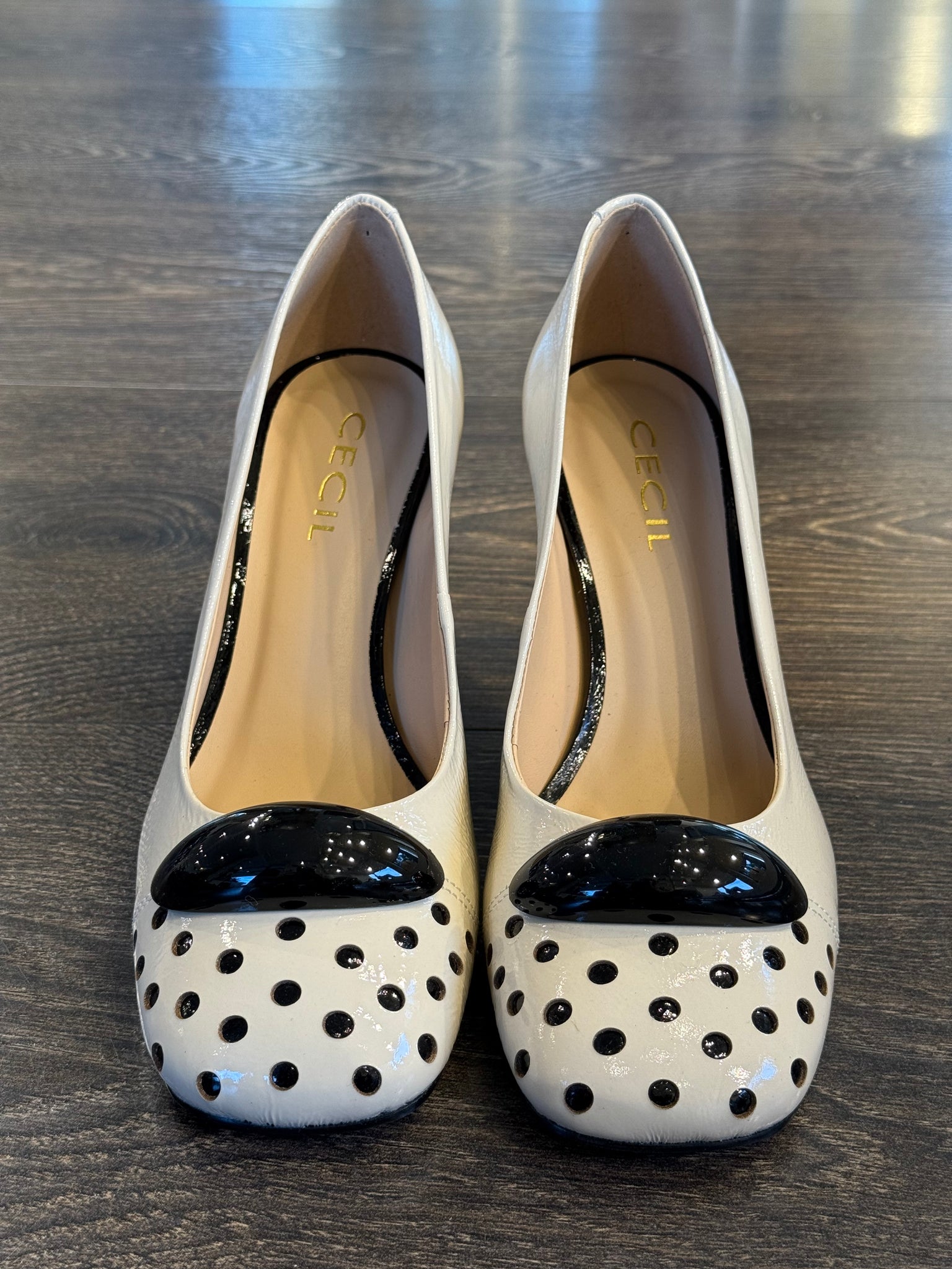 Cecil decollete' in morbido naplack burro,  forma leggermente squadrata, sottopiede imbottito ,fondo gomma antiscivolo ,tacco a clessidra di 7 cm ricoperto nello  stesso materiale ,punta con pois ed accessorio laccato nero