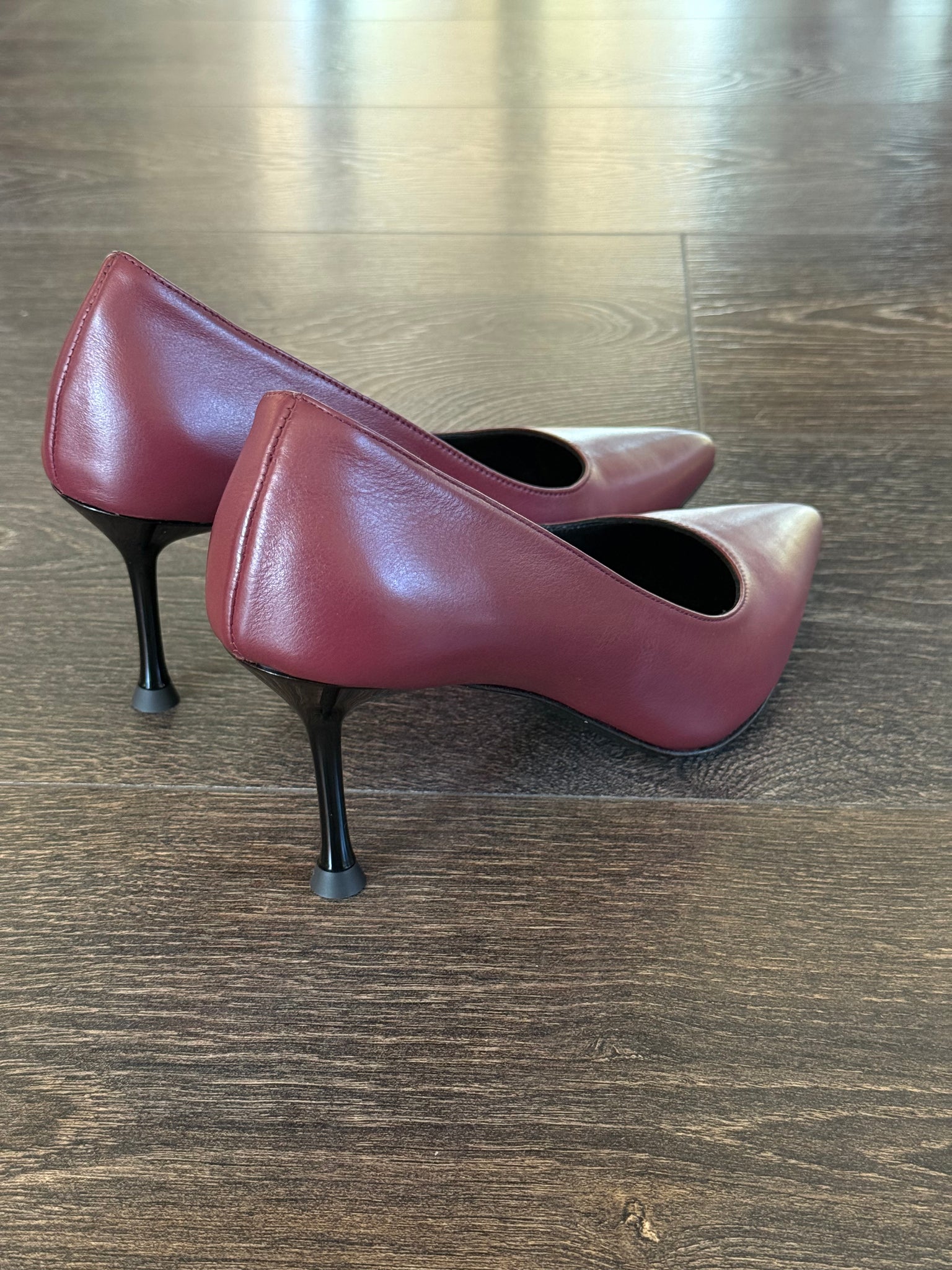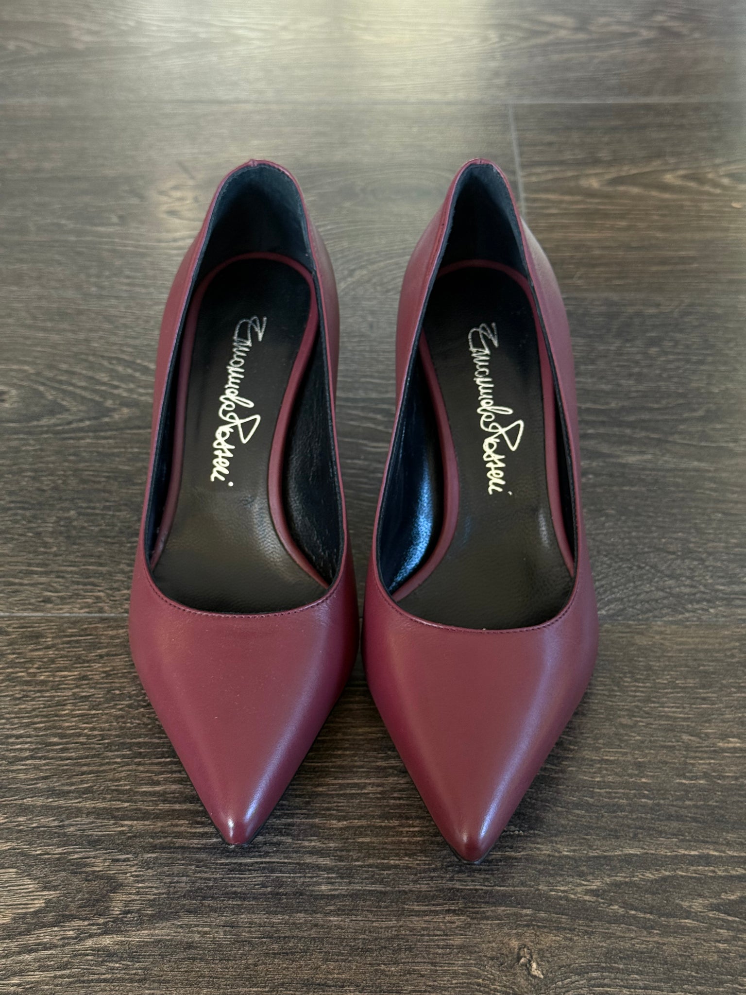 Emanuela Passeri decollete' in morbida pelle bordeaux a forma sfilata, sottopiede leggermente imbottito, fondo cuoio