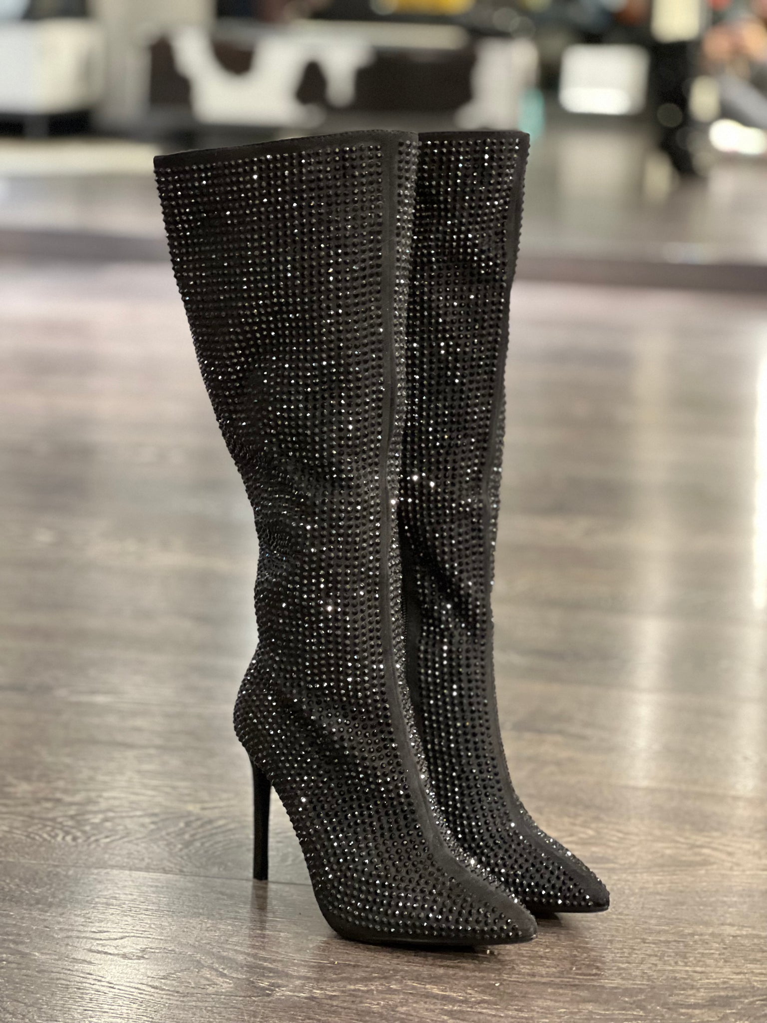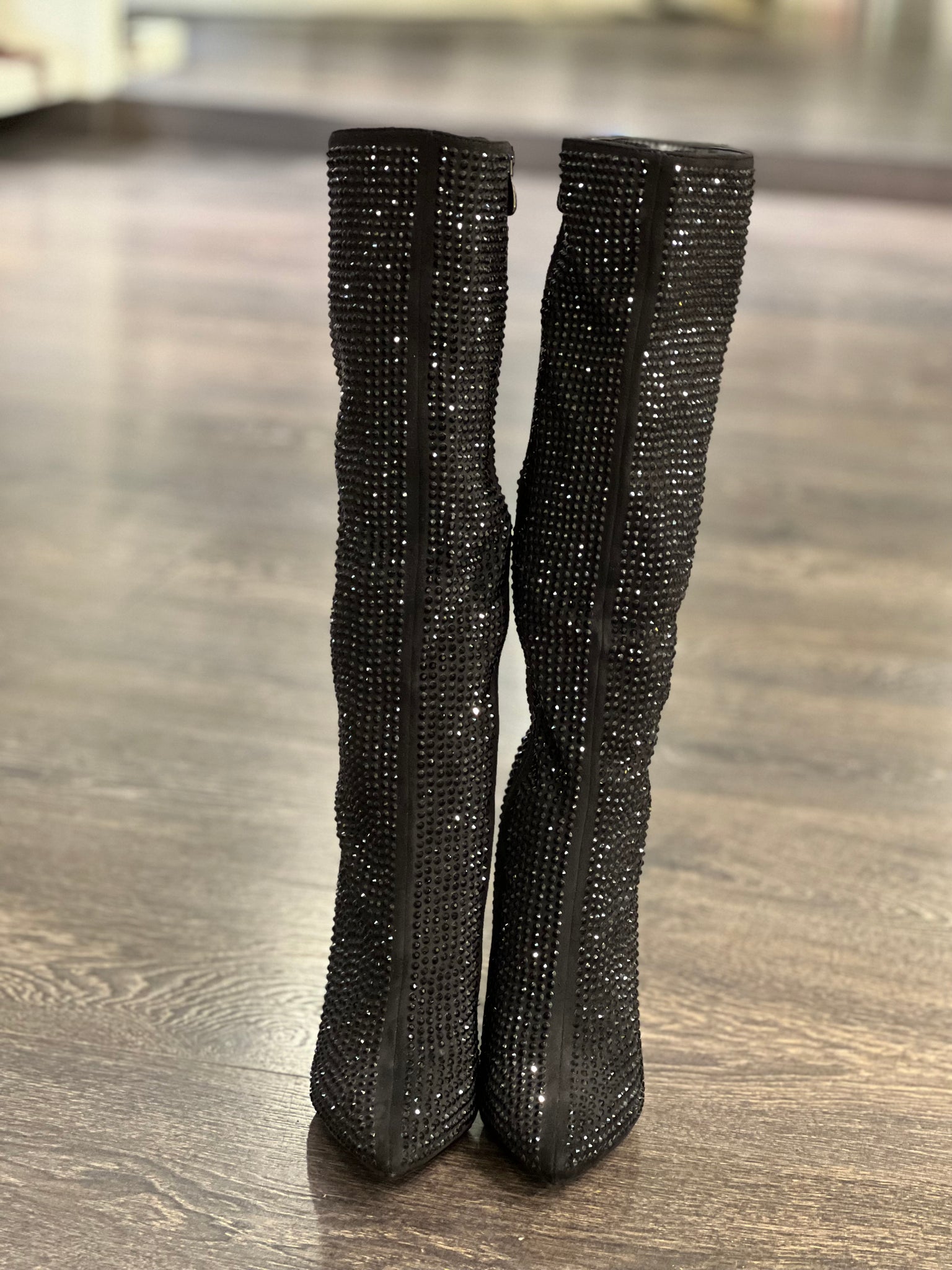 Francesco Milano stivale sotto al ginocchio completamente ricoperto di strass neri ,a forma sfilata ,tacco a spillo di cm 10,sottopiede imbottito