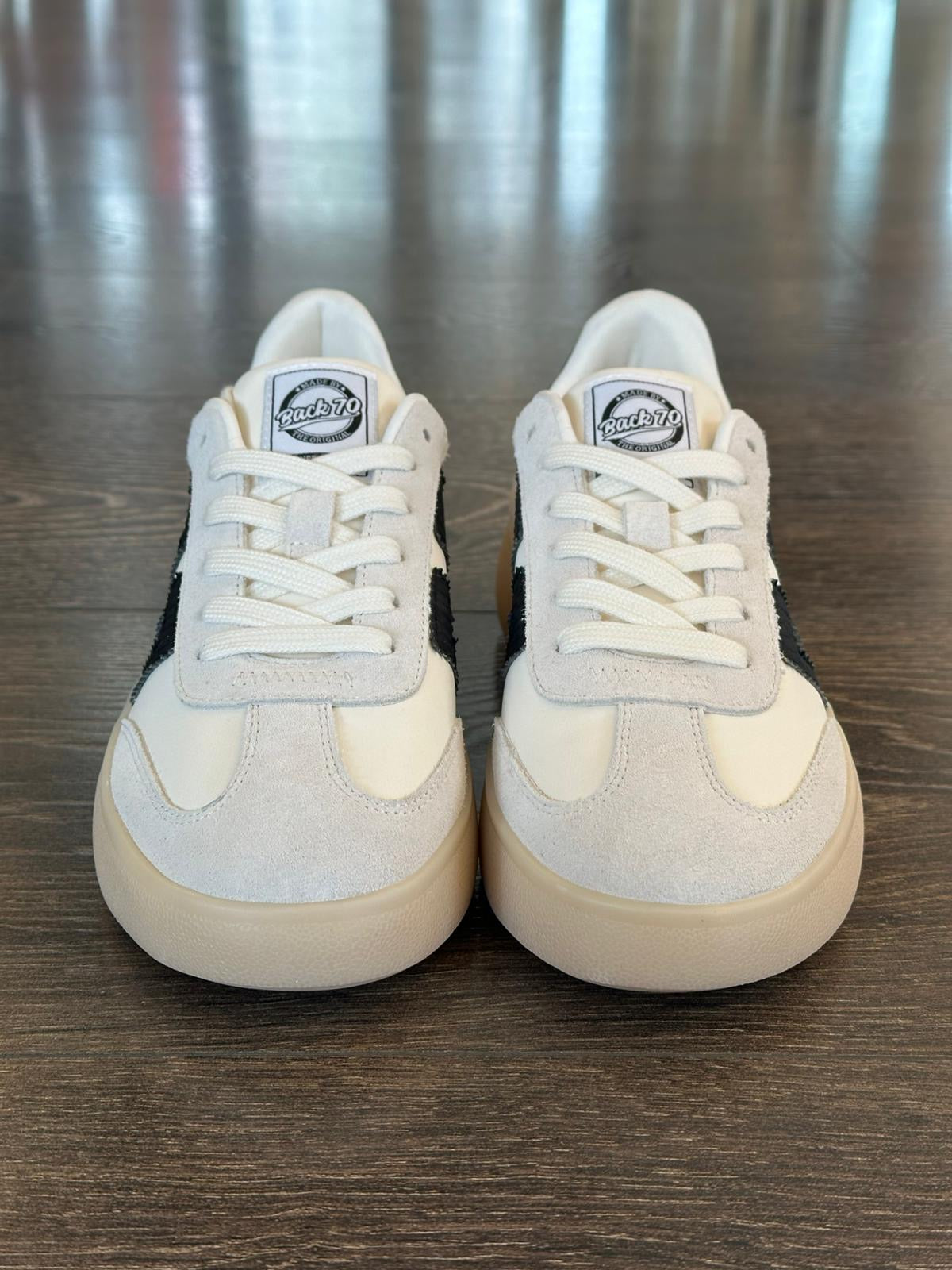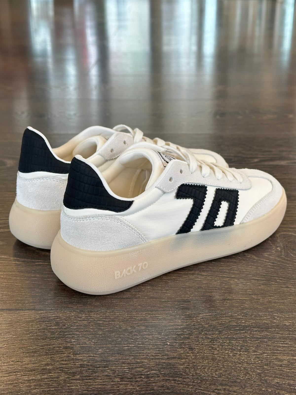 La sneaker con plateau Brooklyn moderna e raffinata, pelle bianca, punta e tiralacci in morbida pelle scamosciata, una sottile suola con plateau che aggiunge un tocco di stile. questa sneaker con logo e tallone in pelle nera è sportiva ma raffinata, senza tempo ma innegabilmente attuale.