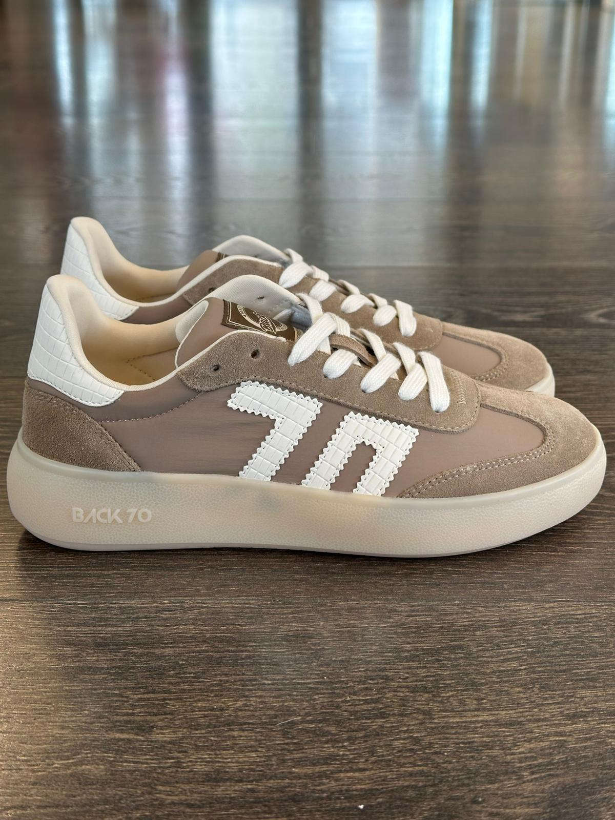 La sneaker con plateau Brooklyn moderna e raffinata in tessuto taupe , punta e tiralacci in morbida pelle scamosciata in tinta, una sottile suola con plateau che aggiunge un tocco di stile. questa sneaker con logo e tallone in pelle bianca è sportiva ma raffinata, senza tempo ma innegabilmente attuale.