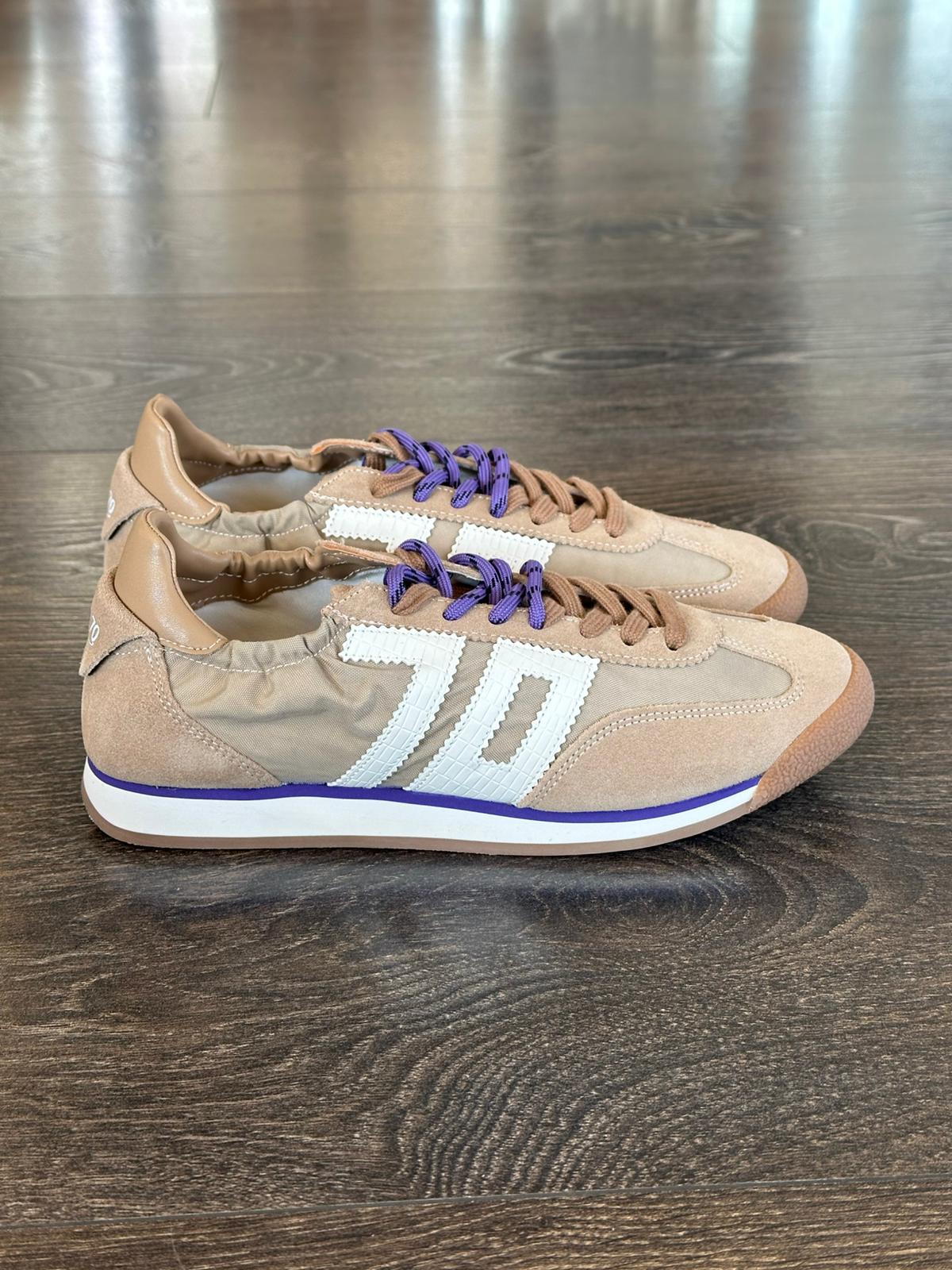 Back 70 sneaker ultraleggera e flessibile, tessuto baige ,puntale ,tiralacci e tallone in crosta in tinta, presenta un'apertura elasticizzata per un comfort ottimale ed è facile da indossare ,logo bianco, doppio laccio beige ed uno viola cosi' come il dettaglio della suola