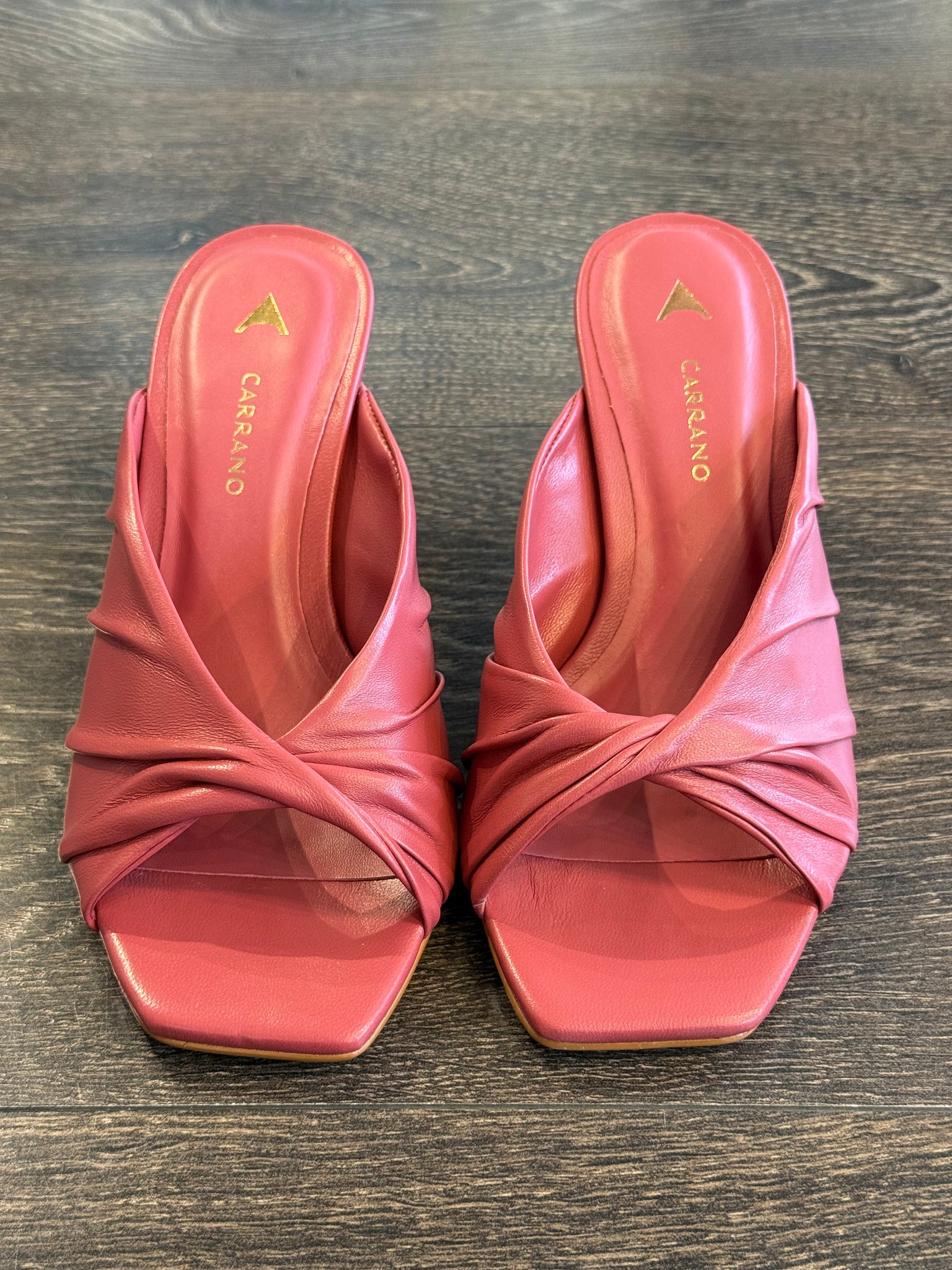 Mule in morbida pelle fragola, forma squadrata tacco leggermente a rocchetto di 6 cm ricoperto nello stesso materiale